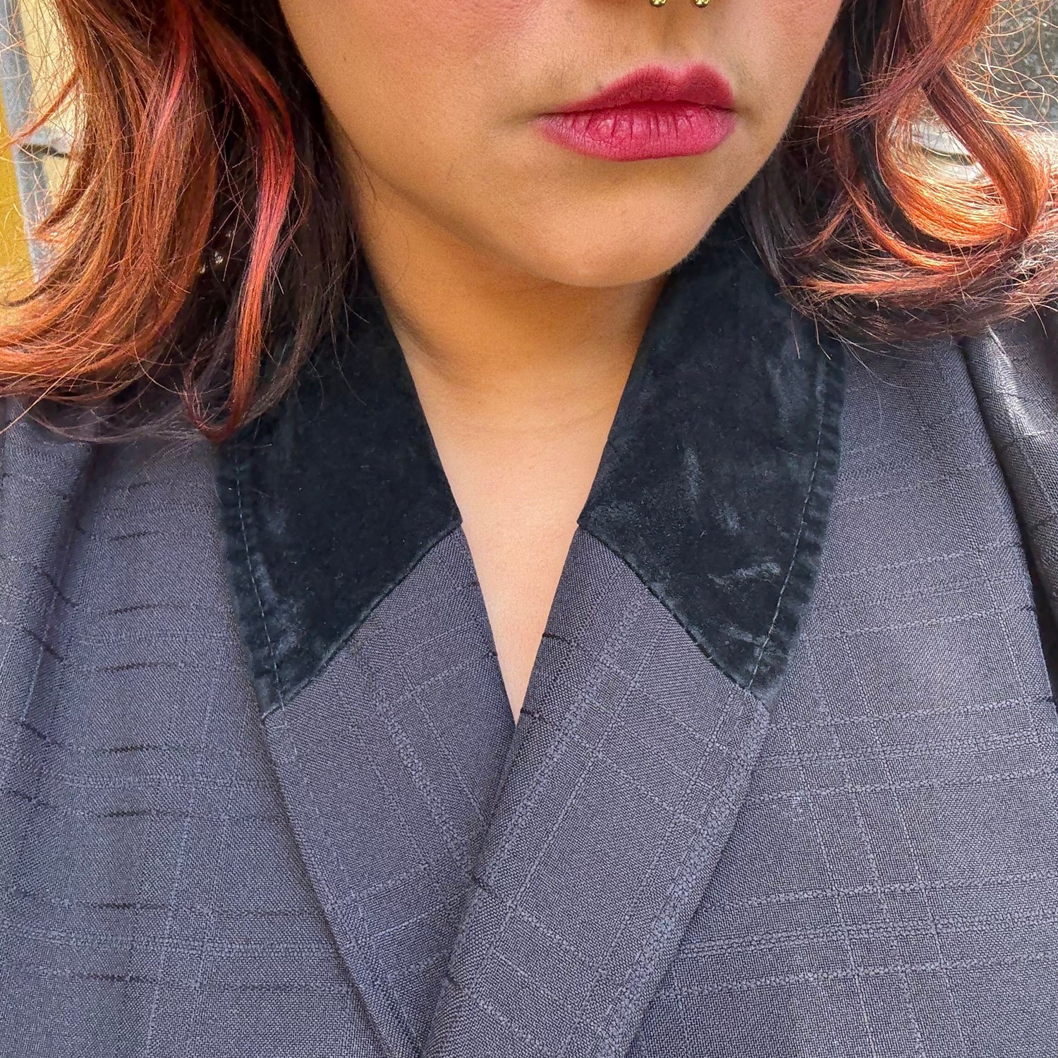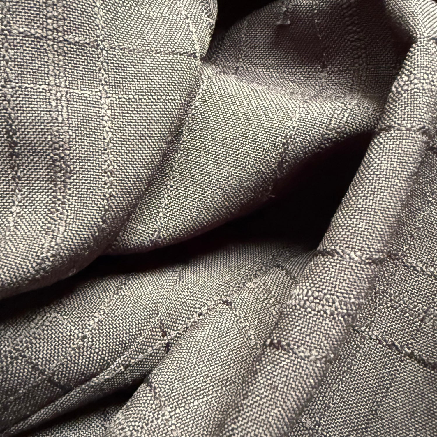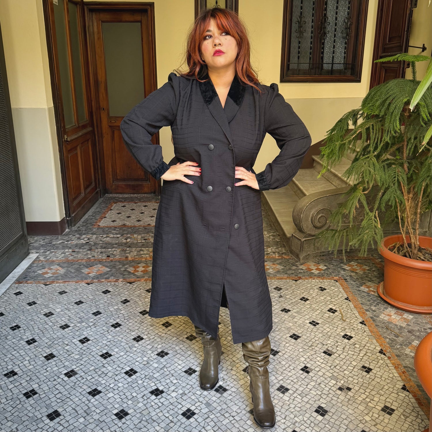 questo abito/ spolverino sartoriale nero con fantasia tono su tono a righe è elegantissimo nella sua semplicità. Doppio petto ma i bottoni sono facilmente gestibili senza stringere. Polsini e colletto sono in velluto nero e ha le tasche laterali. Maniche leggermente a sbuffo. Veste over dalla tg 44 in poi.