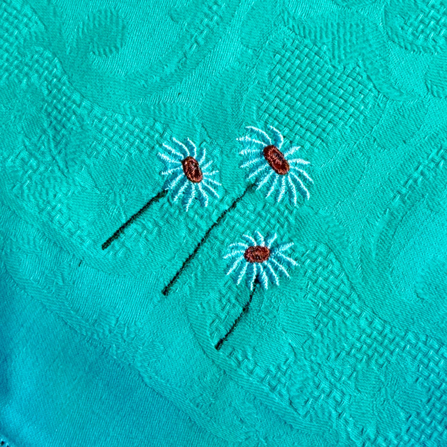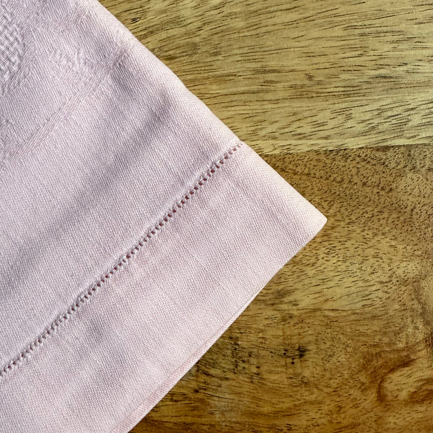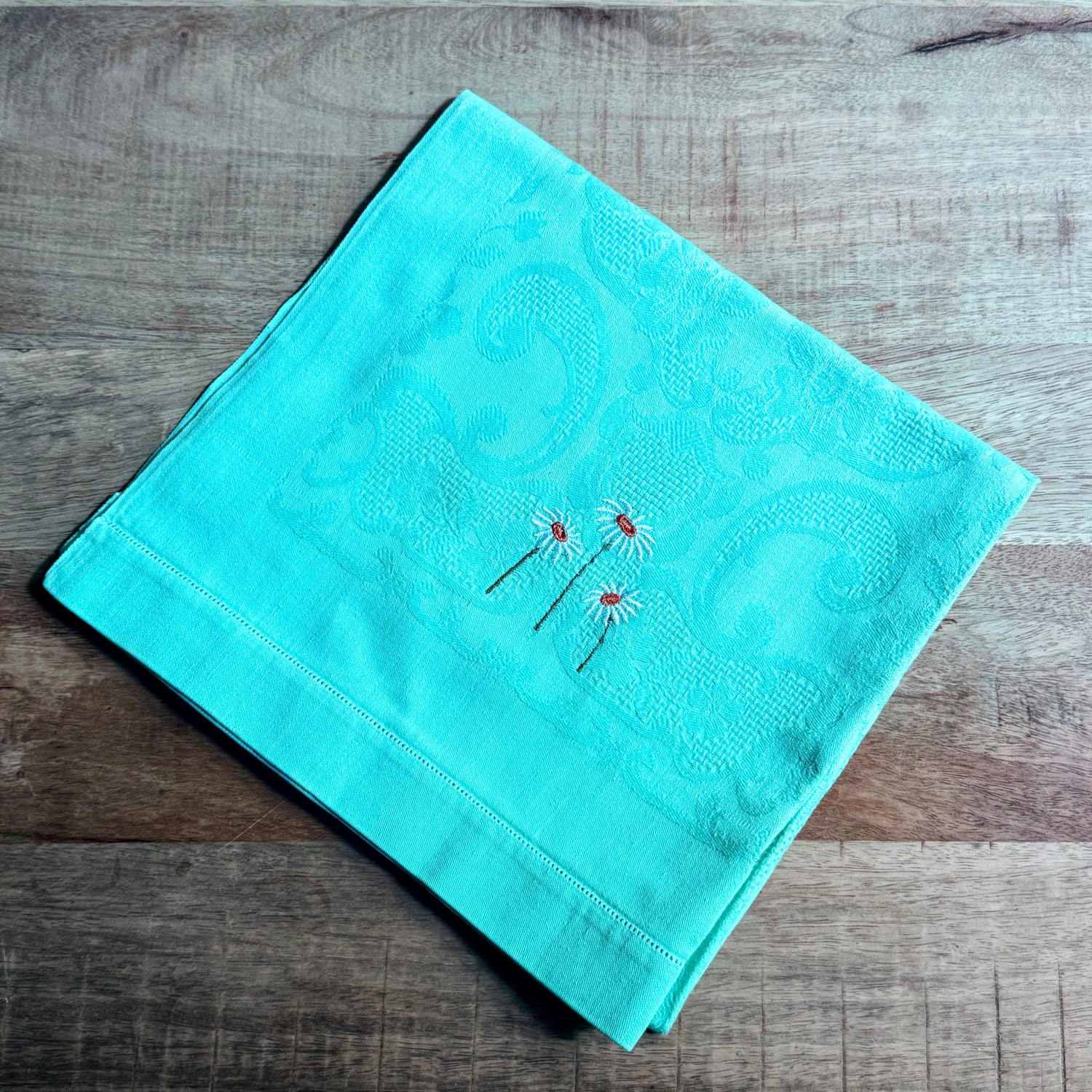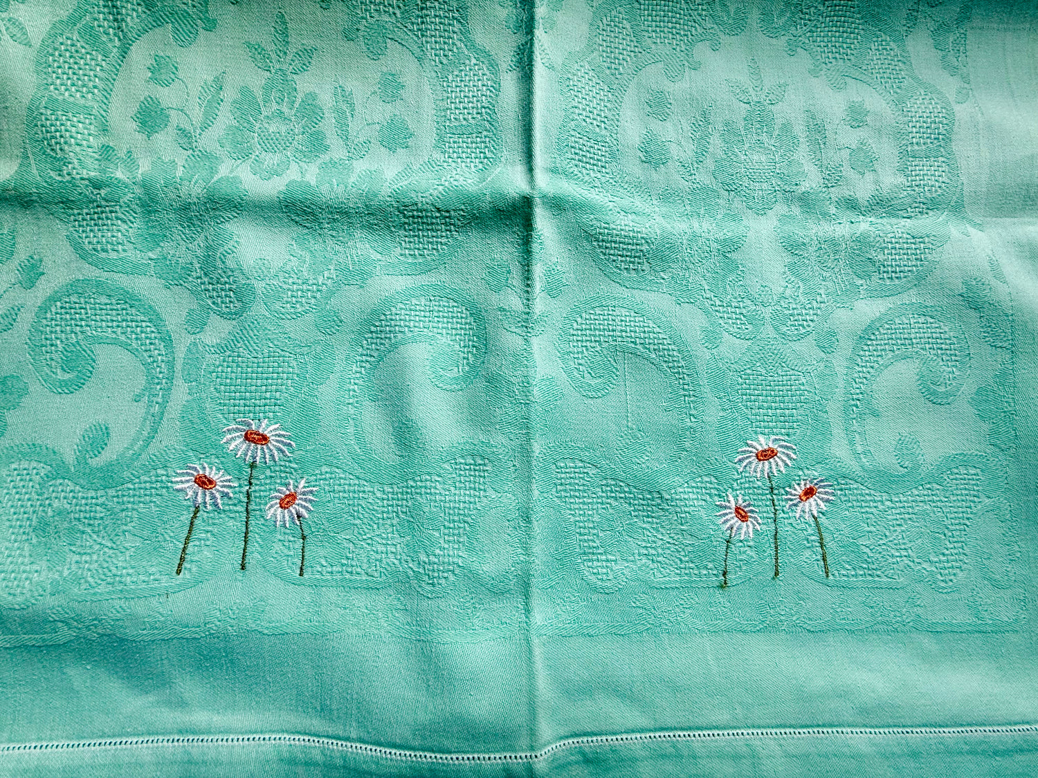 Coppia di meravigliosi asciugamani vintage in lino cotone. Rigorosamente ricamati con profili in ricamo a giorno. Uno color verde Tiffany con margherite , l’altro rosa confetto con fiore 🌷.Â