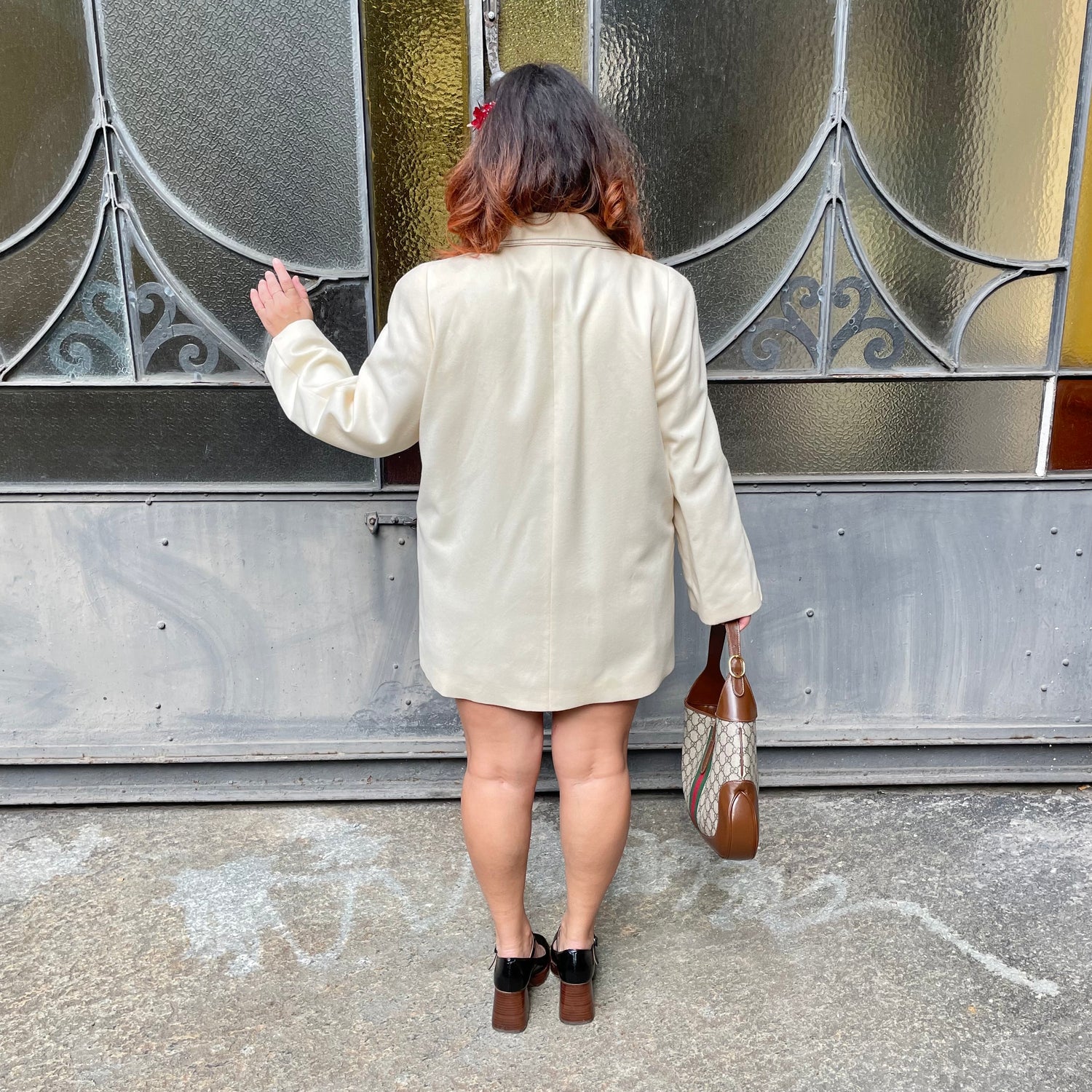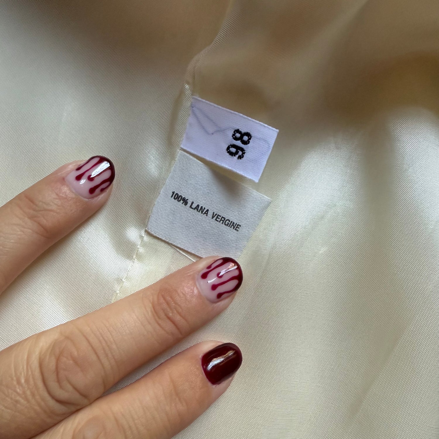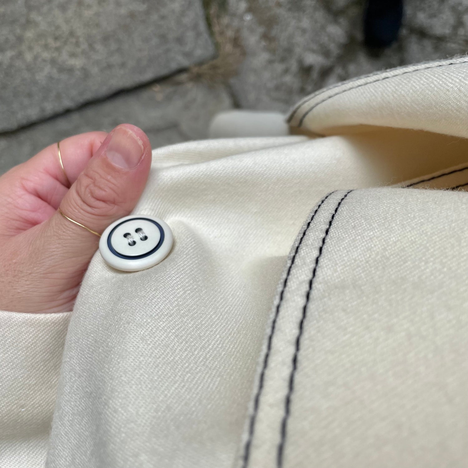 incredibile valse vintage color panna con cuciture a contrasto e bottoni uguali. Ha un fit stupendo oltre al fatto che essendo in lana tiene decisamente caldo.