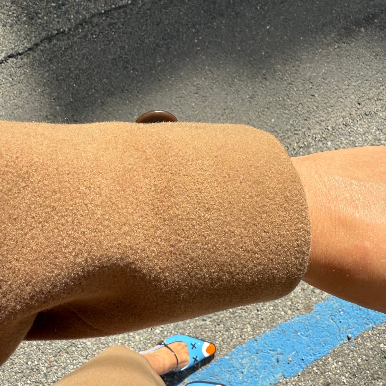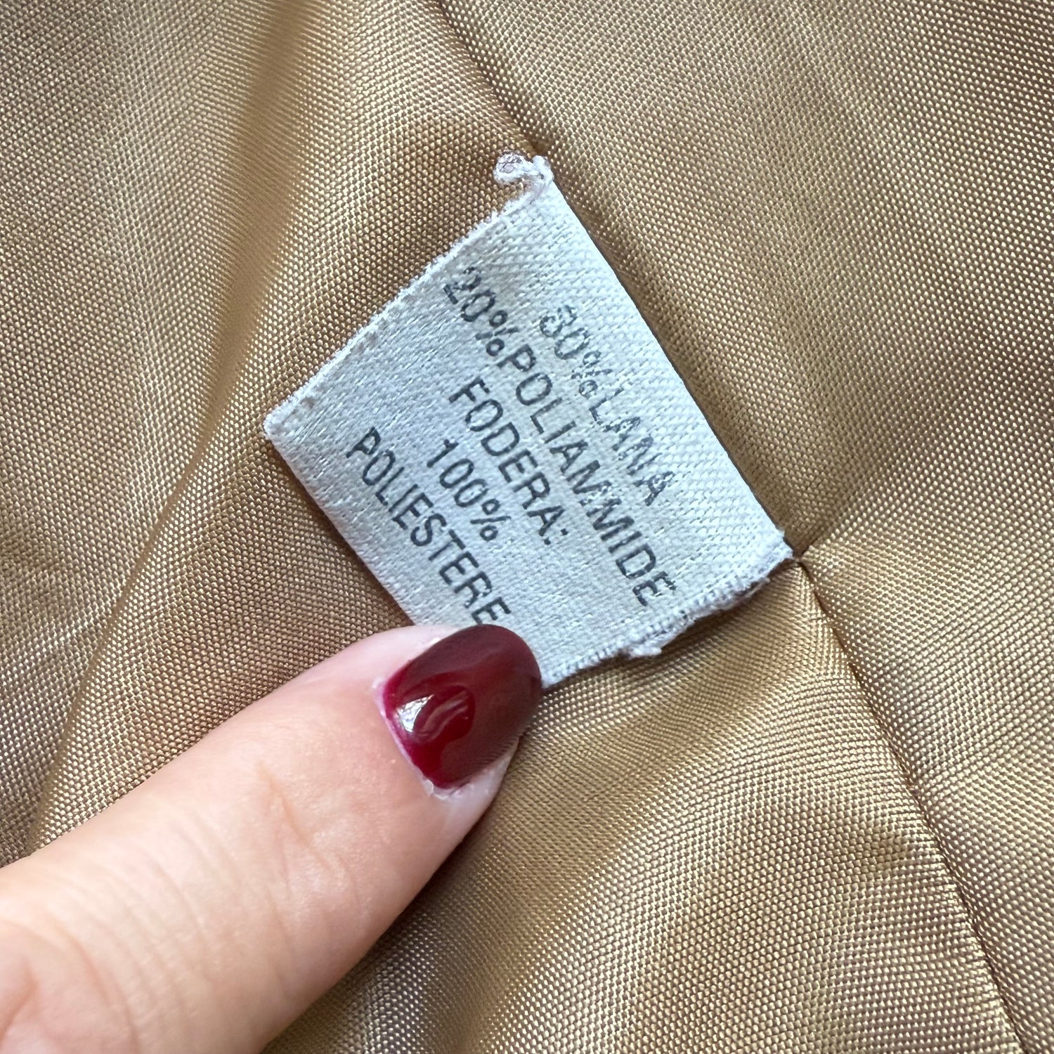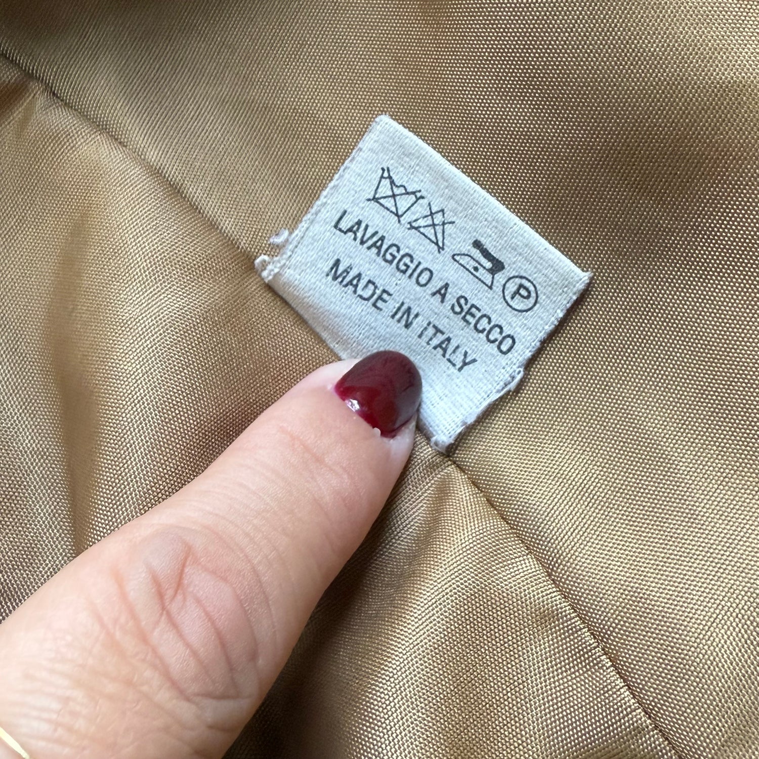 classico cappotto vintage dai colori autunnali: ocra e biscotto. Ha un bellissimo fit con il collo in velluto cioccolato. Elegantissimo . Veste comodo dalla tg 46 in poi.