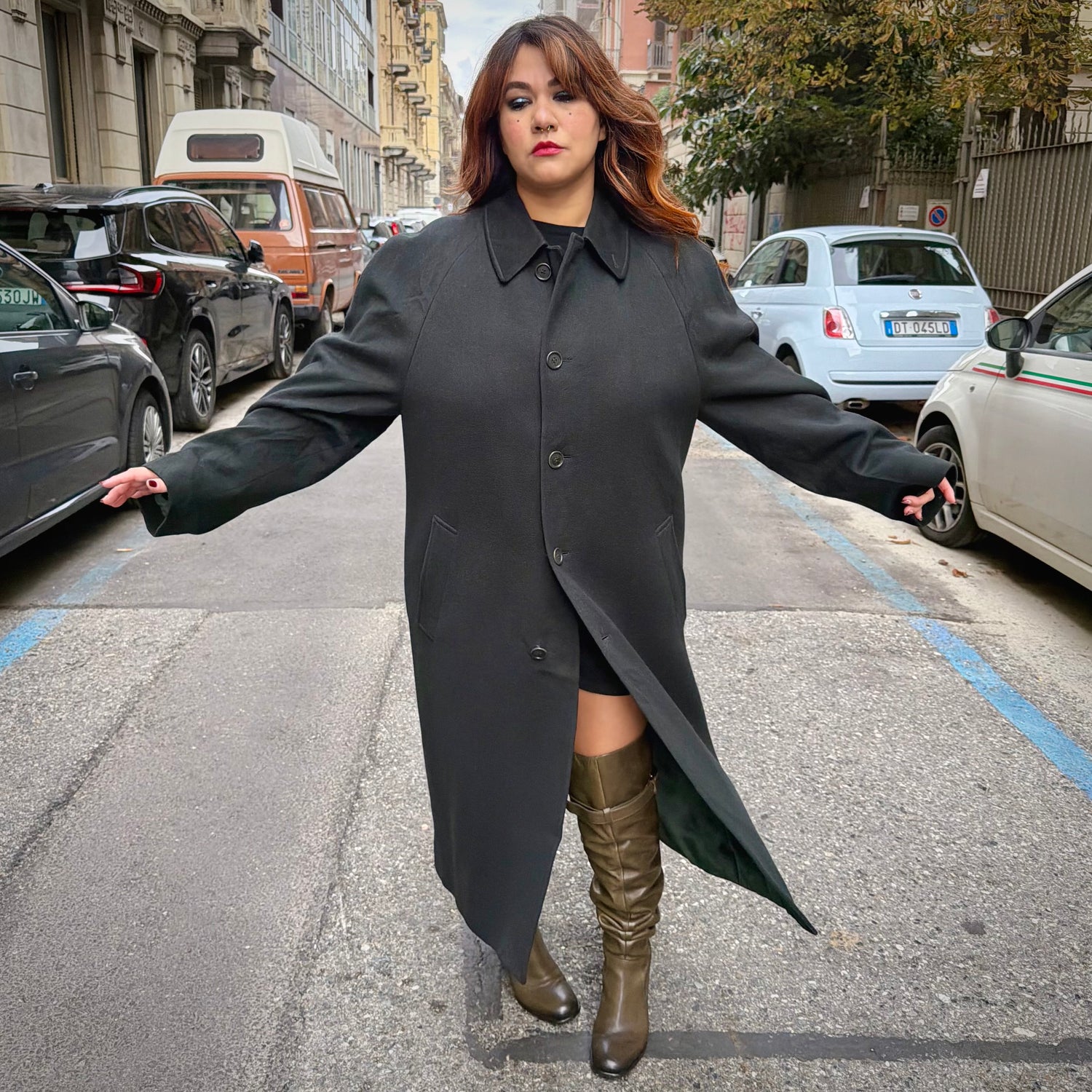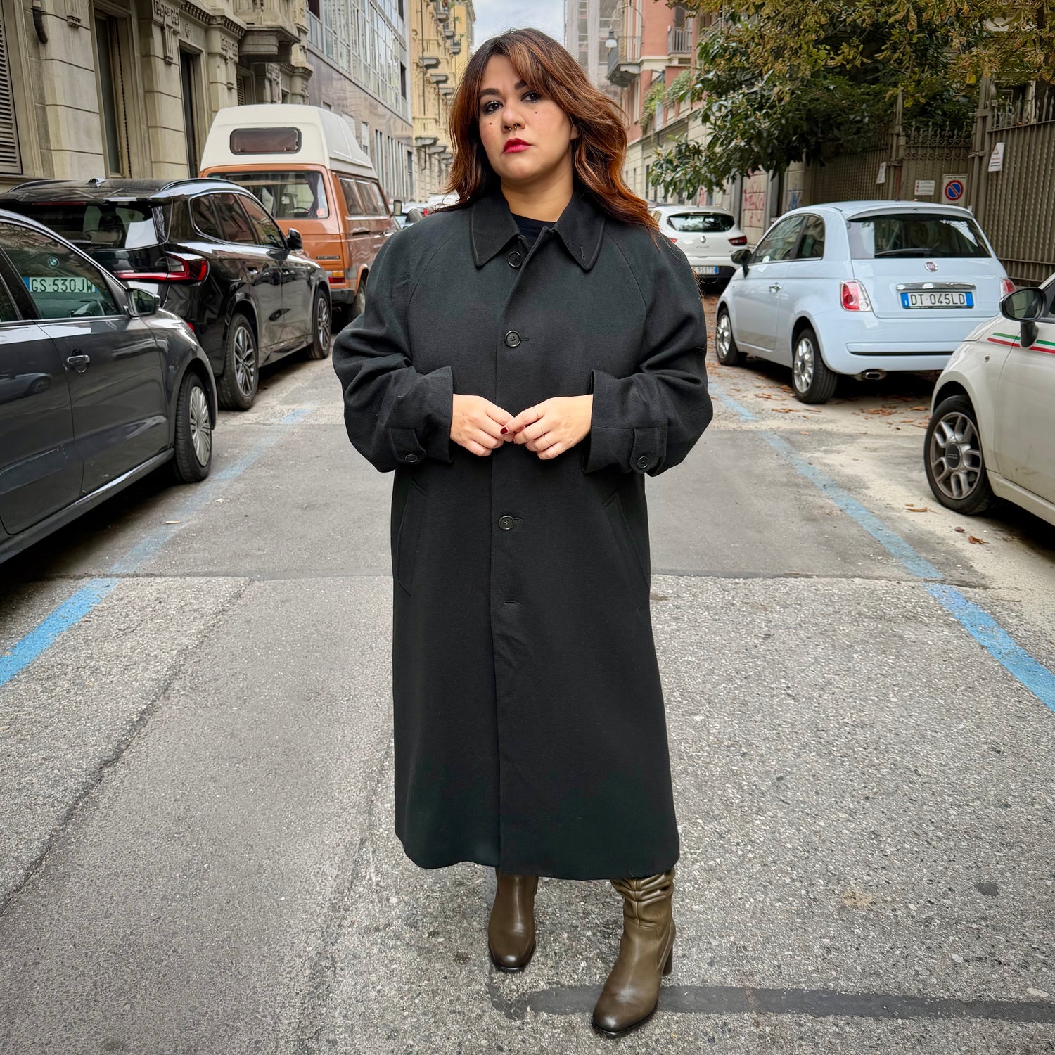 bellissimo cappotto pulito e lineare nella sua forma più semplice. Colore verde pino molto scuro con bottoni dello stesso colore. Nasce da uomo ma come moltissimi capi vintage é perfettamente unisex, trovo sia davvero bello Sun una donna grintosa. Rimane sottile ma caldo perfetto per chi non vuole aggiungere troppi strati. Veste over dalla tg 46 in poi.