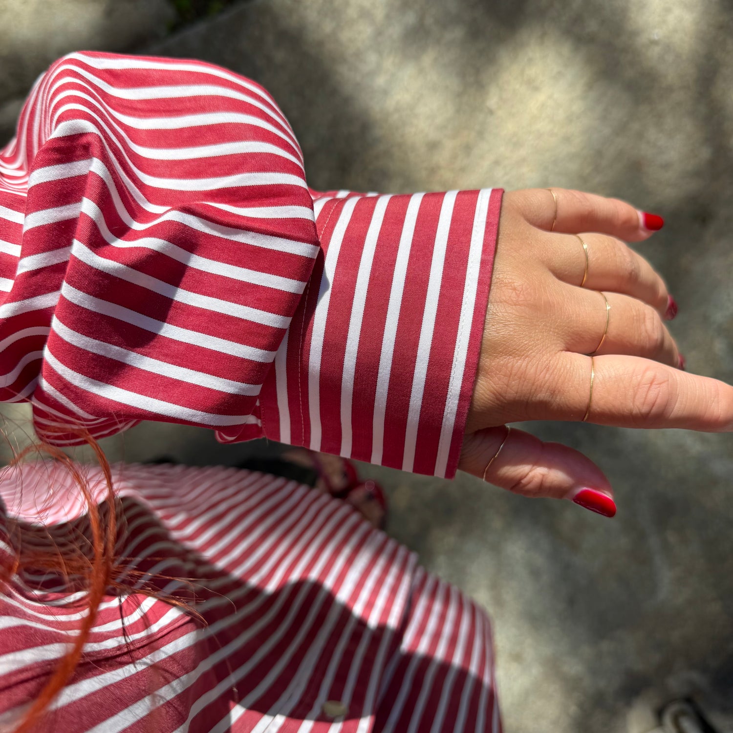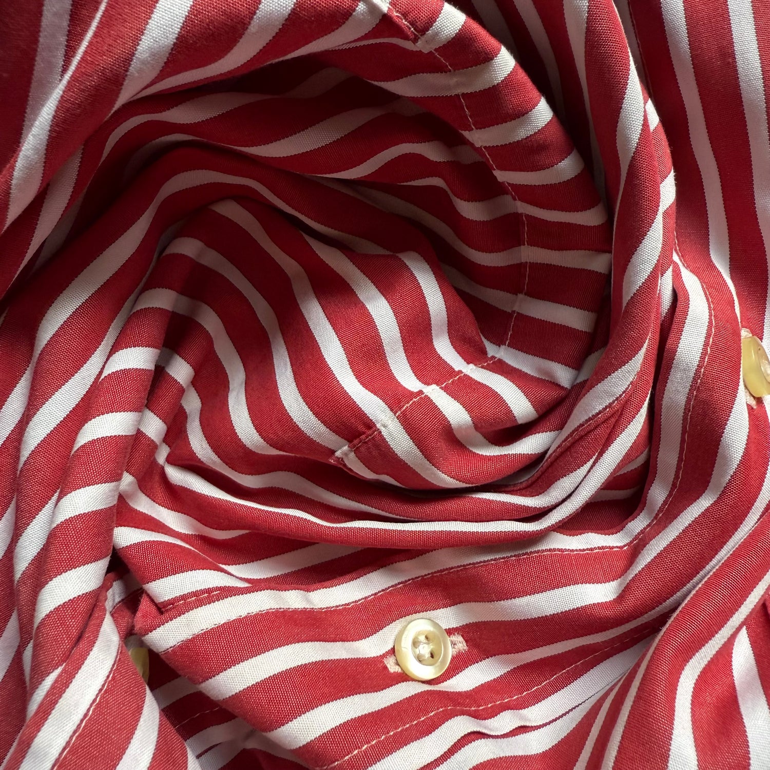 Stupenda camicia unisex di Fendi utilizzabile tutto l’anno. Righe rosse e bianche verticali che allungano la figura e bottoni in madreperla. Bella anche portata aperta in estate. Veste over dalla tg 46 in poi.