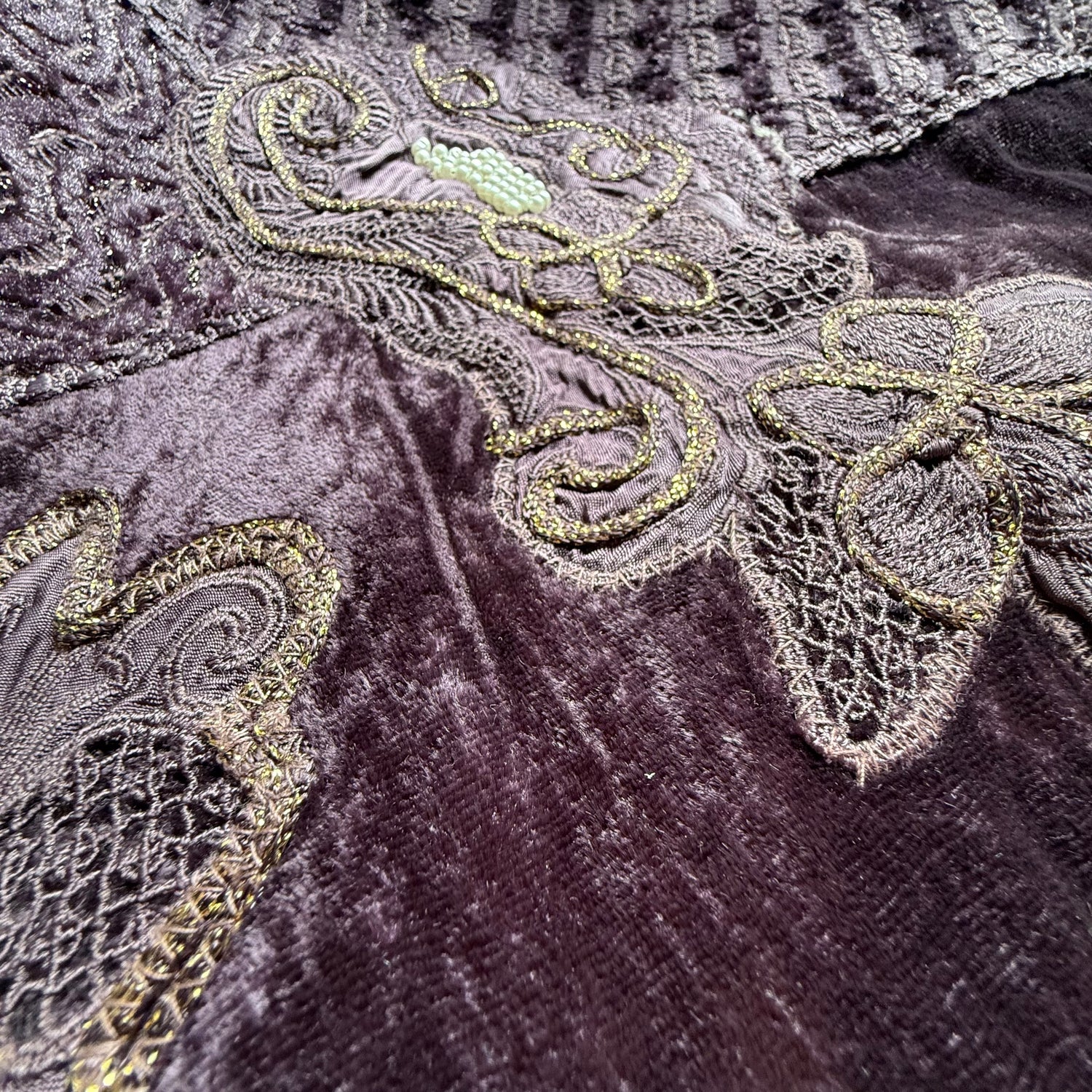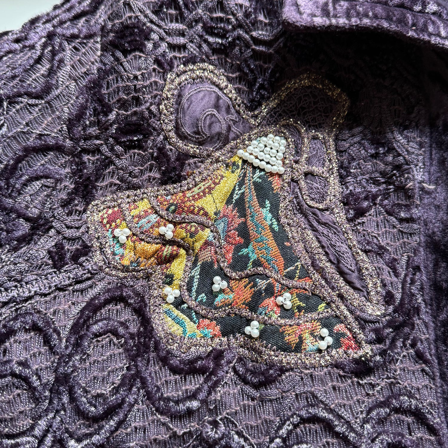 lei è perfetta se vi sentite un po’ streghe anni ‘90. Colore viola prugna principalmente in velluto con tanti disegni ricamati tra perle e fili dorati. È abbastanza pesante e fluffy con spalline morbide. Non presenta etichette purtroppo. Veste over dalla tg 46 in poi.