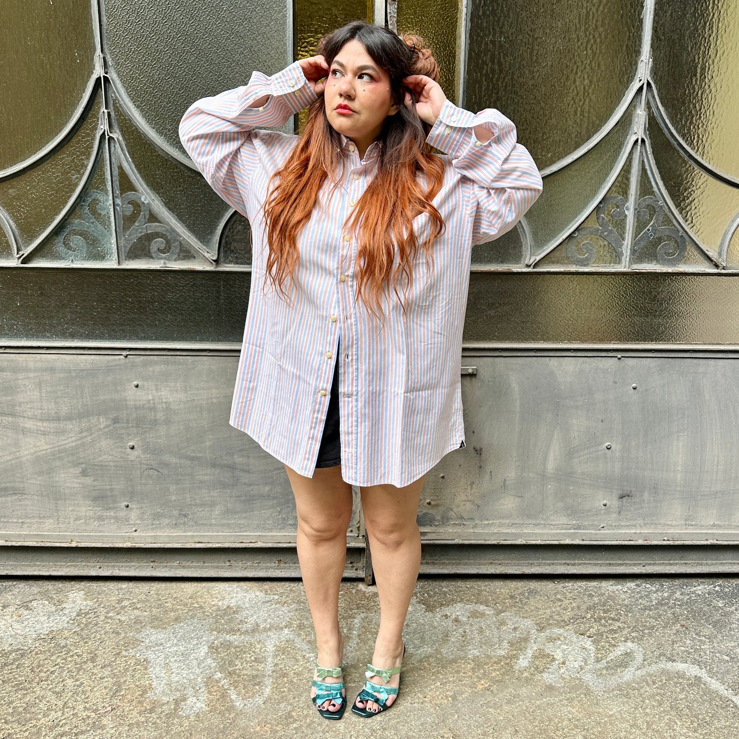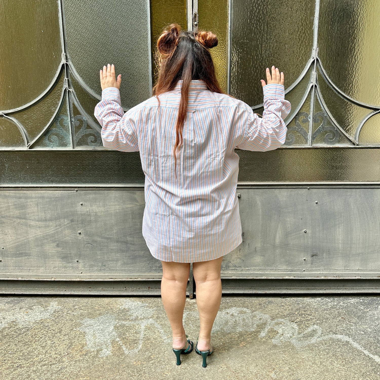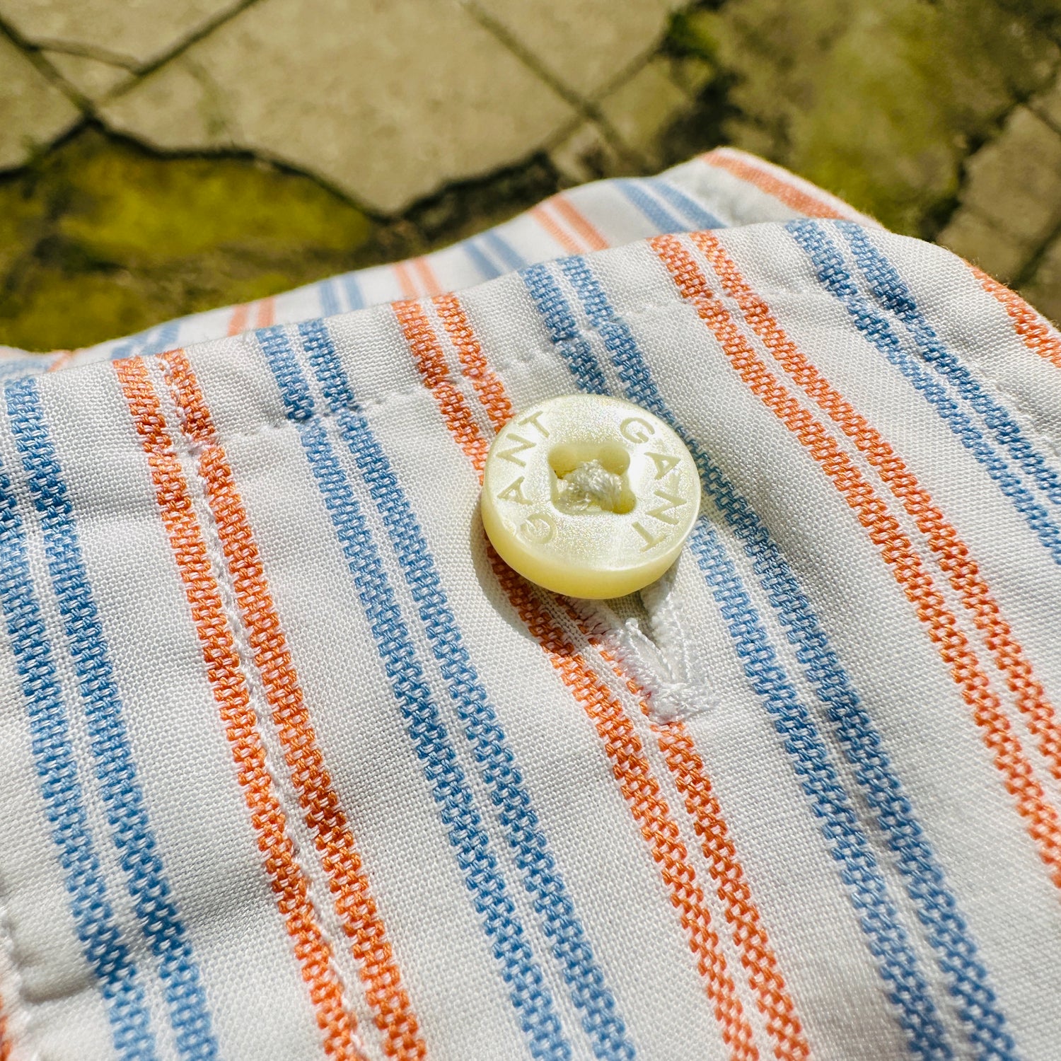 Camicia Gant meravigliosa e unisex molto over.base bianca a piccole righe azzurre e salmone. Tessuto di grande qualità e bottoni con logo in madreperla.tg indicata XXL ma veste anche di più. Consiglio portata over dalla tg 48 in poi.