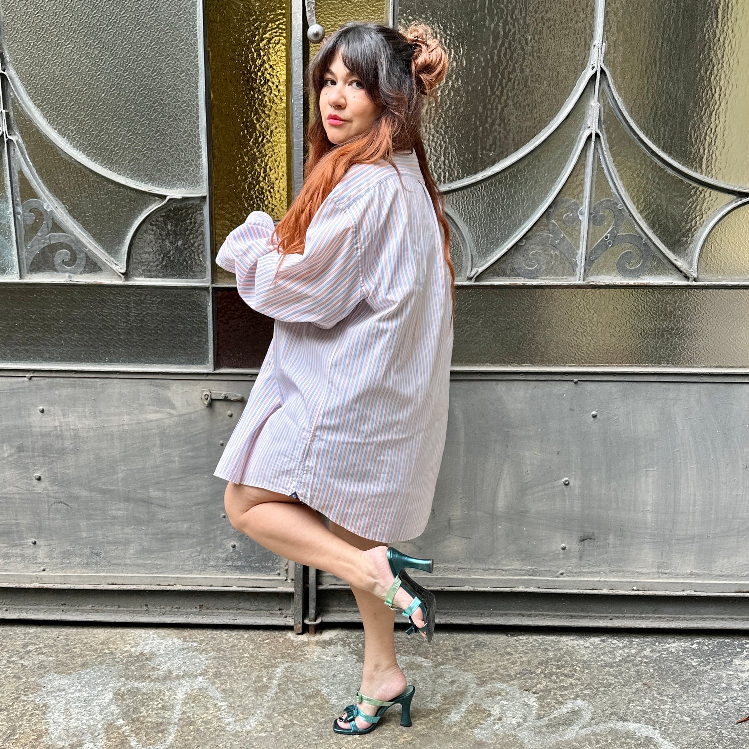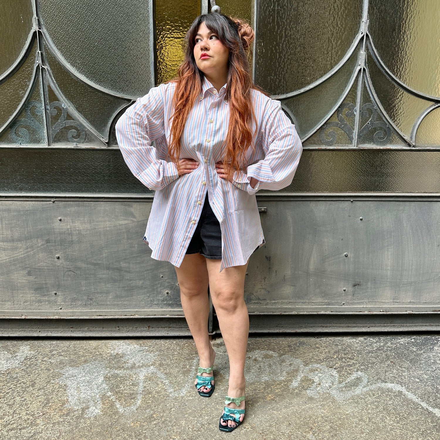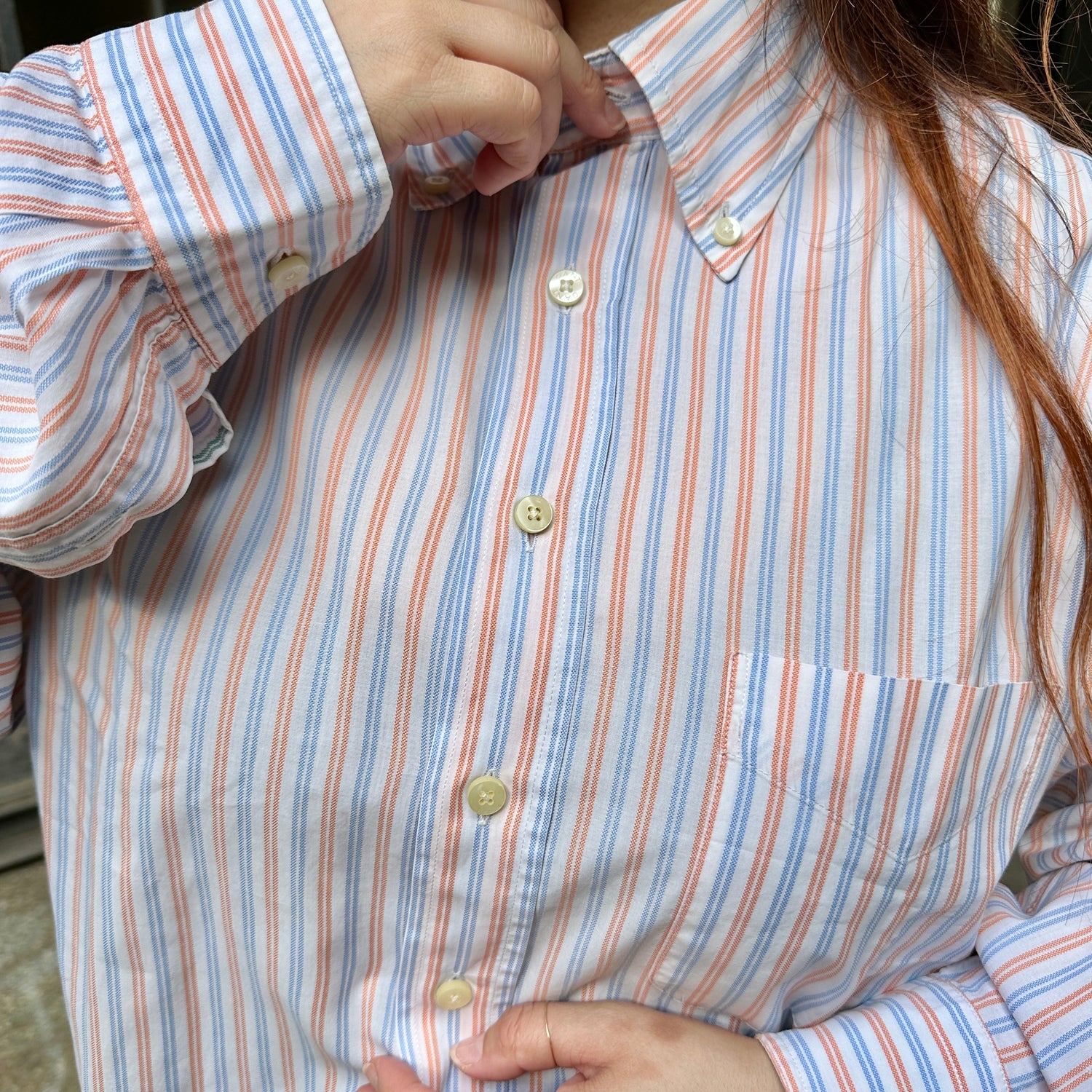 Camicia Gant meravigliosa e unisex molto over.base bianca a piccole righe azzurre e salmone. Tessuto di grande qualità e bottoni con logo in madreperla.tg indicata XXL ma veste anche di più. Consiglio portata over dalla tg 48 in poi.
