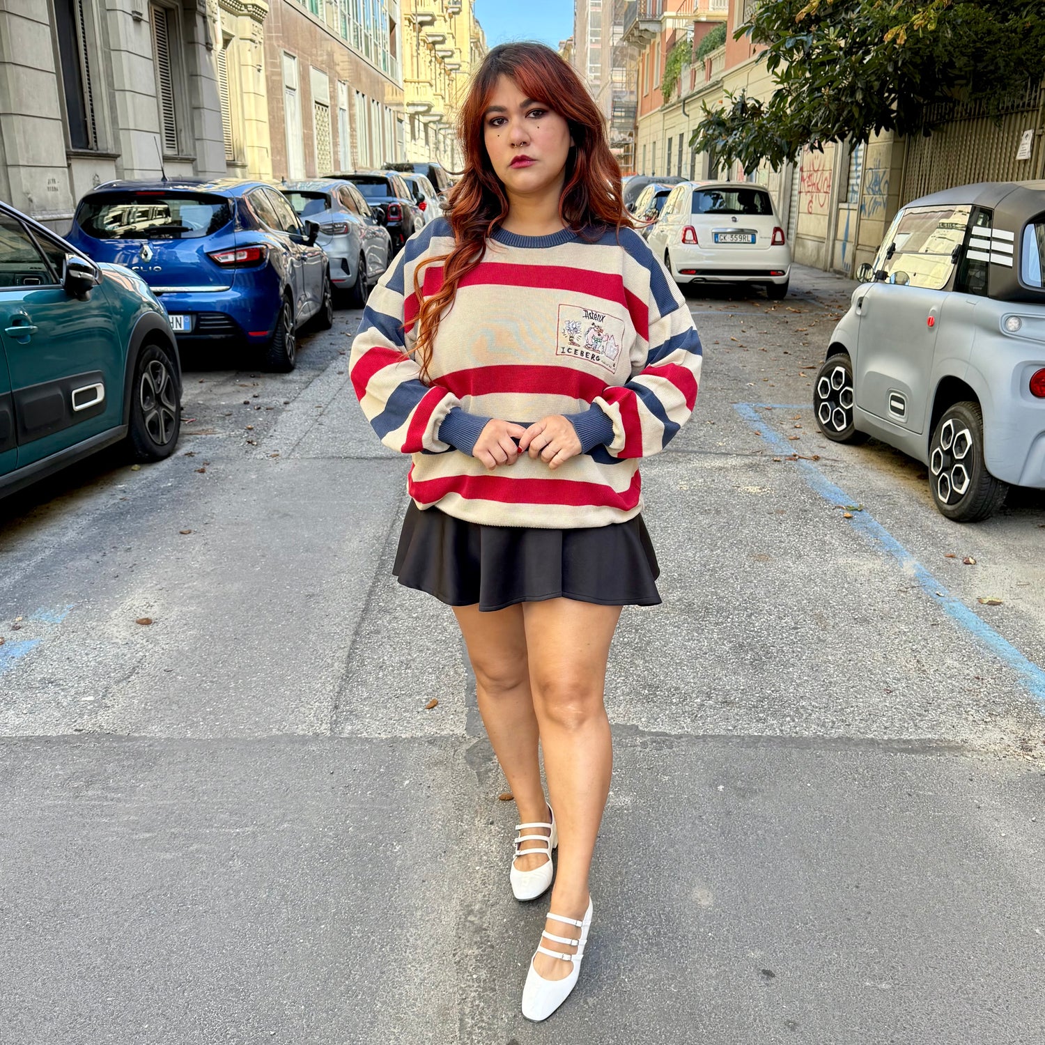 Da collezione: Anno 1988 , incredibile maglione a righe francesi che celebra “Astérix e Obelix” del brand Iceberg. Ironico come tutte le collezioni gioiose del brand. Nonostante sia in cotone rimane molto spesso quindi perfetto tutto l’anno. giuste accortezze. Veste over dalla tg 46 in poi.