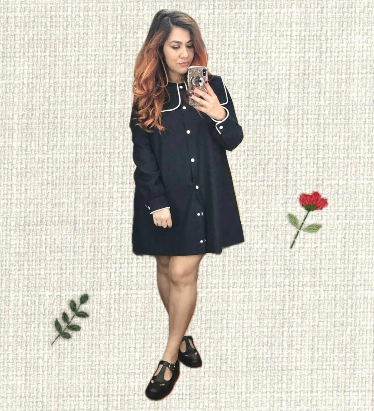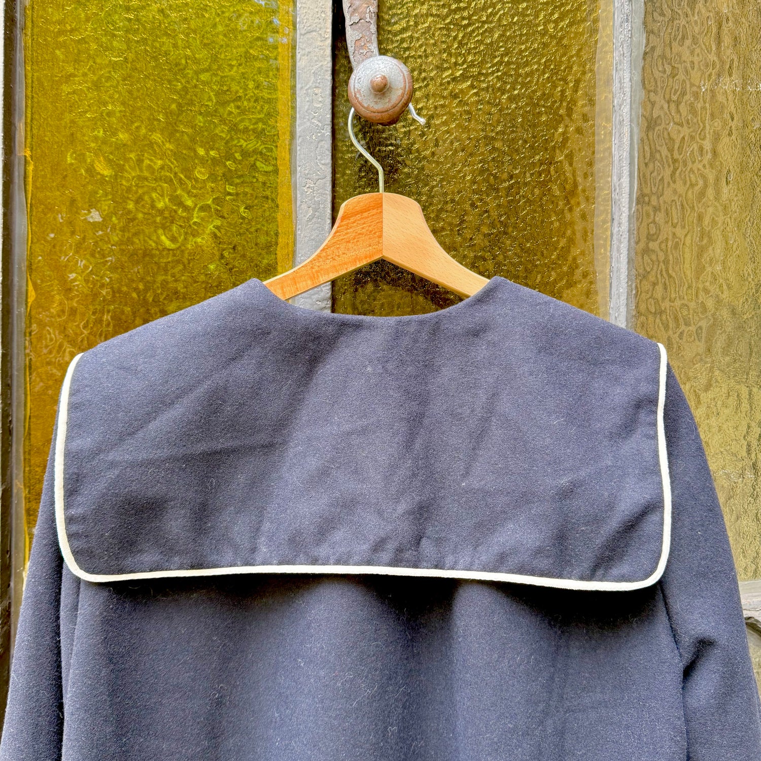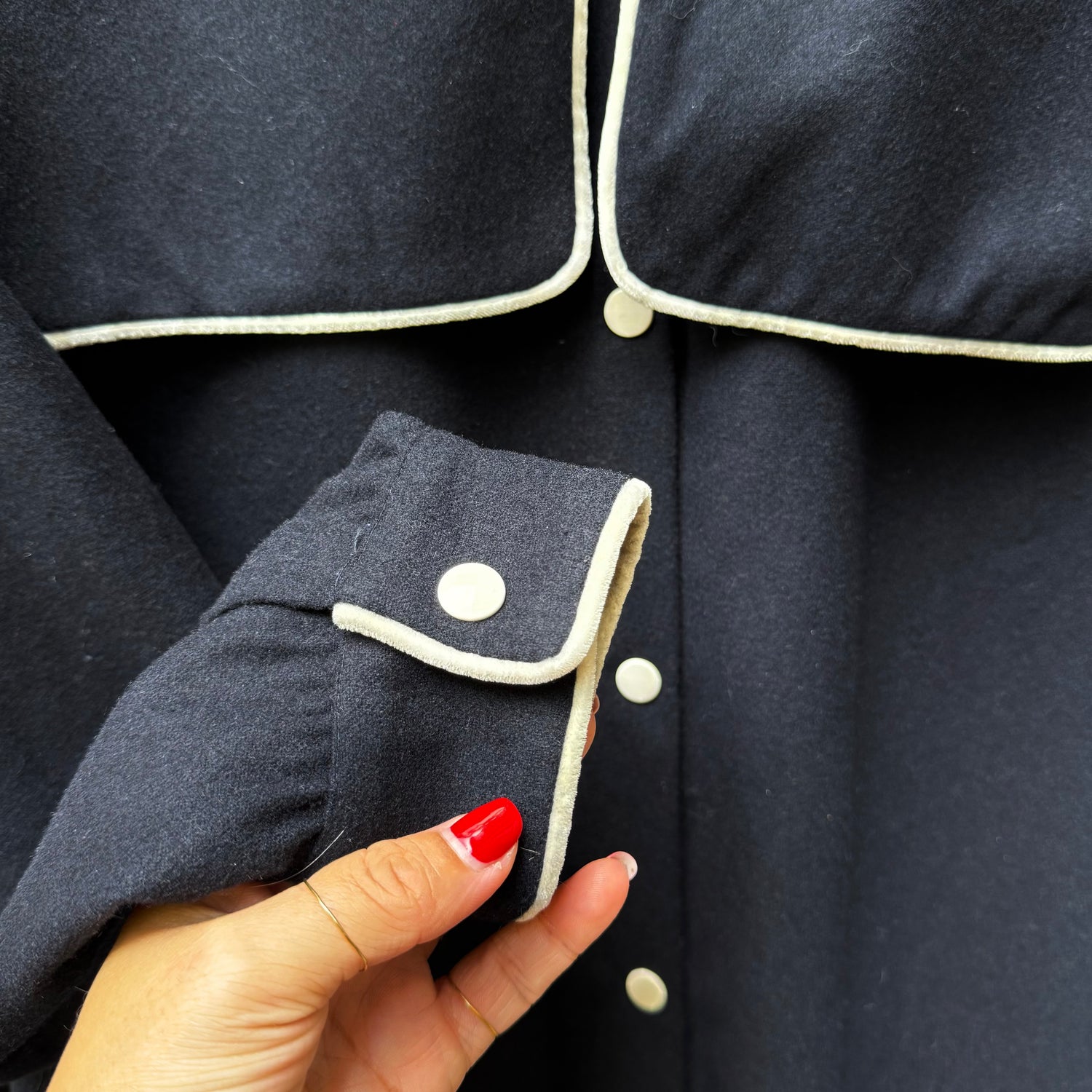 Meraviglioso abito Lazzari di colore blu scuro con colletto alla marinara della collezione autunno/inverno 2020. Bottoni a contrasto percorrono tutto il capo che si può usare anche come spolverino. Tasche laterali.