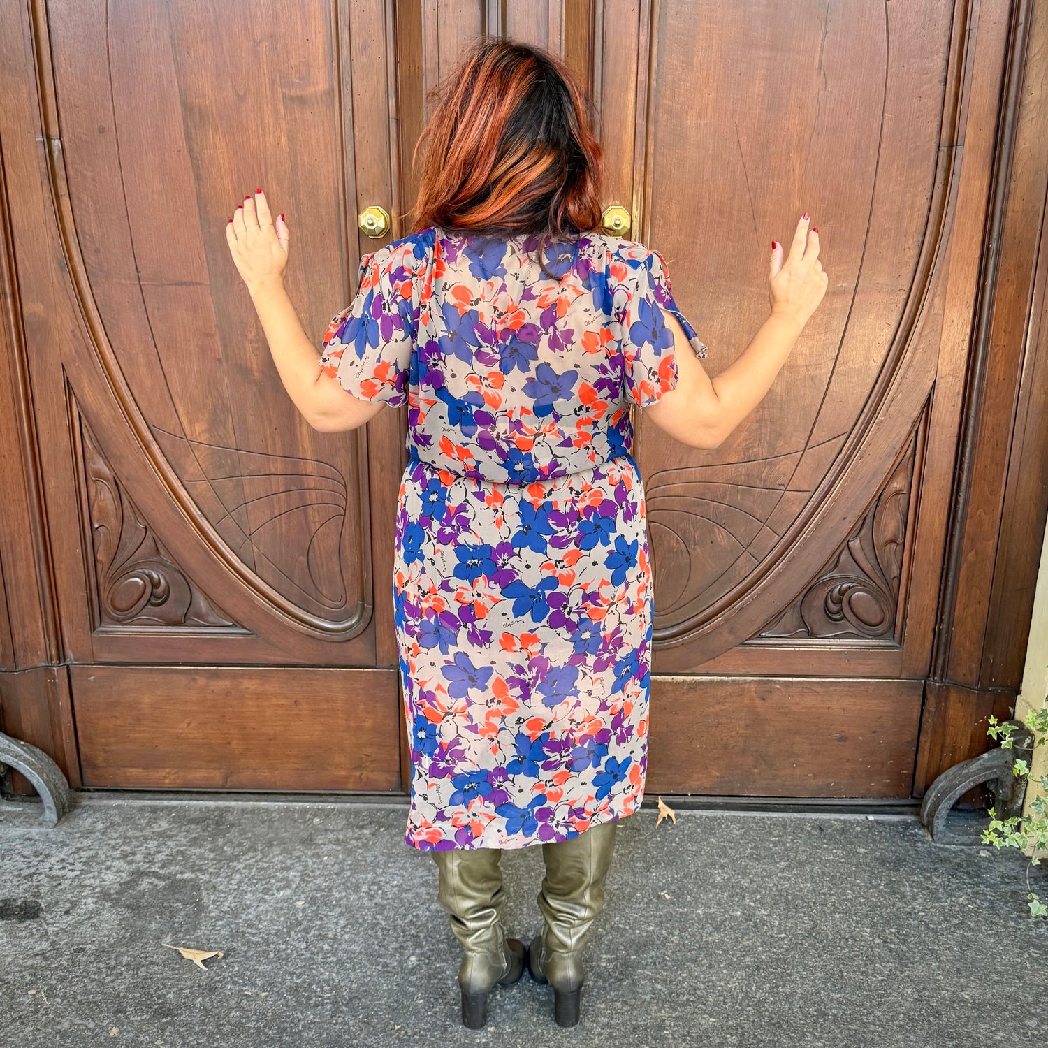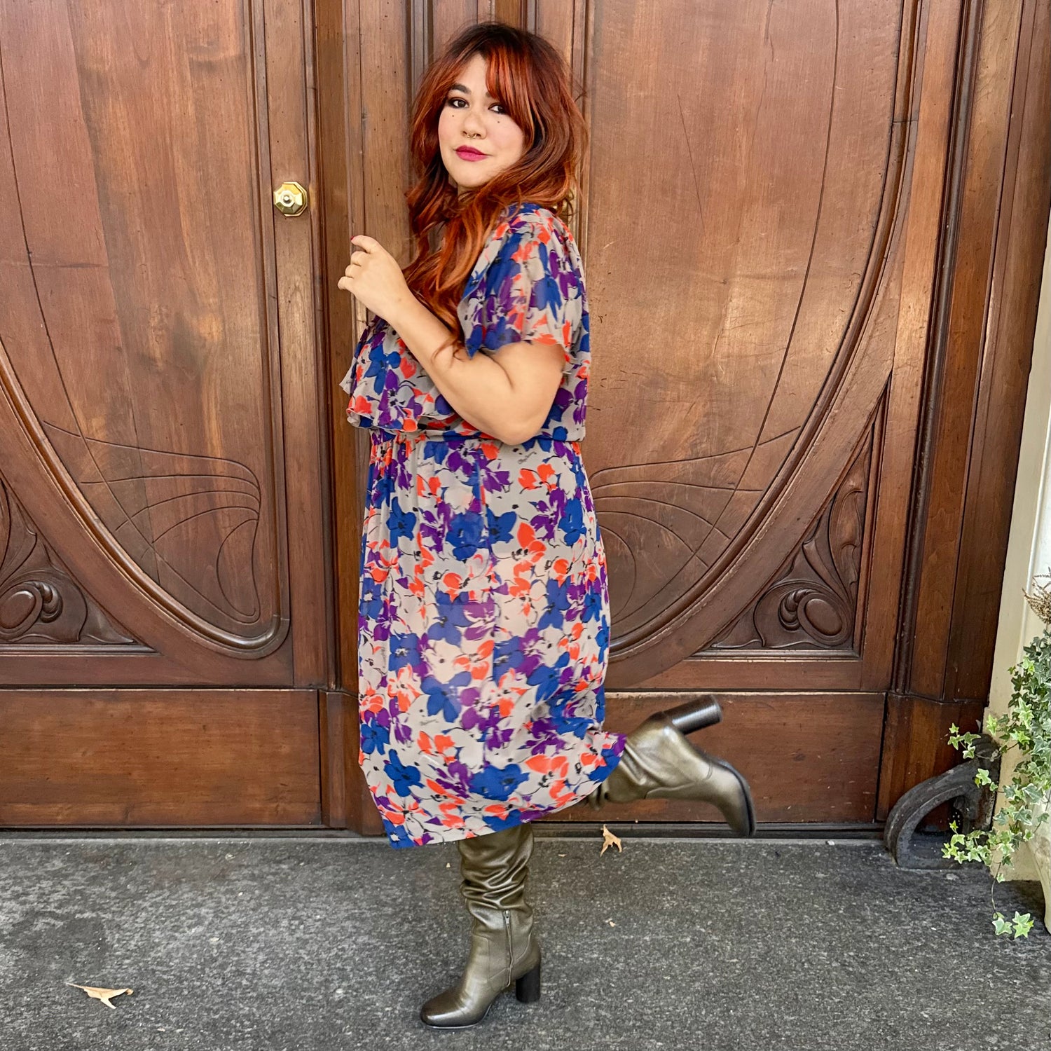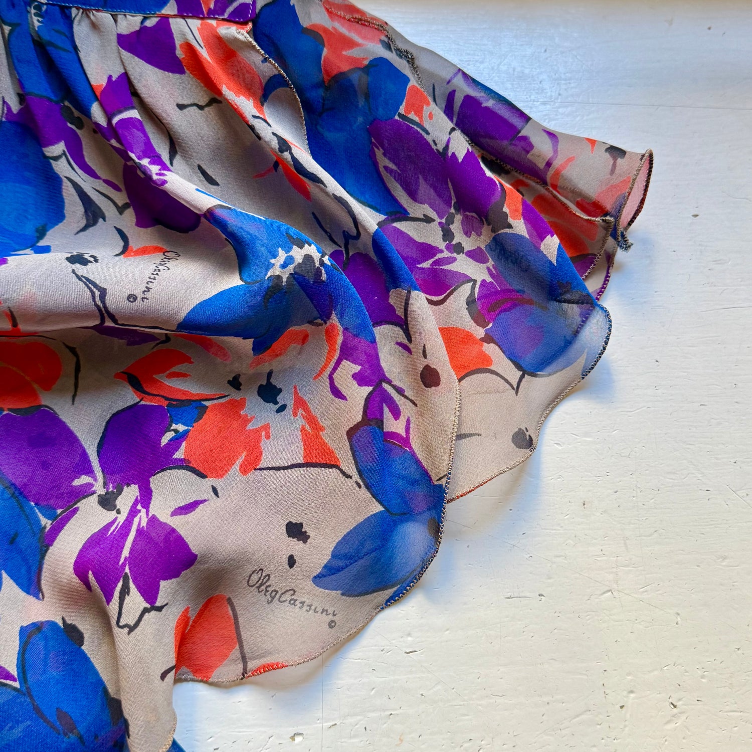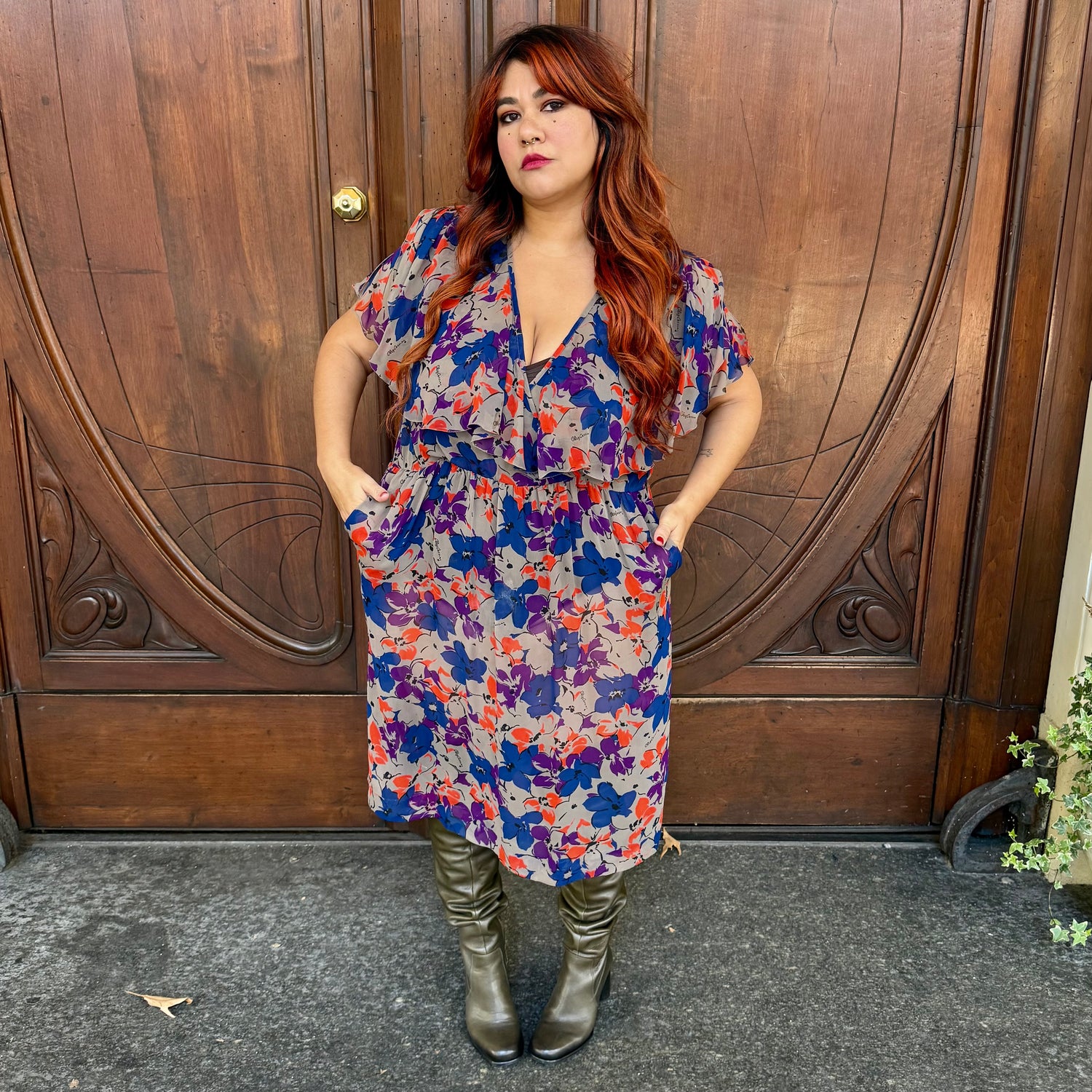 Lui è davvero un pezzo incredibile: Oleg Cassini abito fiori in seta. Ha un fit unico davvero donante, la parte superiore ha uno scollo con volta che non stringe e non ingolfa anche i seni più prosperosi, vita più stenta elastica , tasche laterali e gonna midi. Maniche corte a petalo di fiore,spalline removibili
