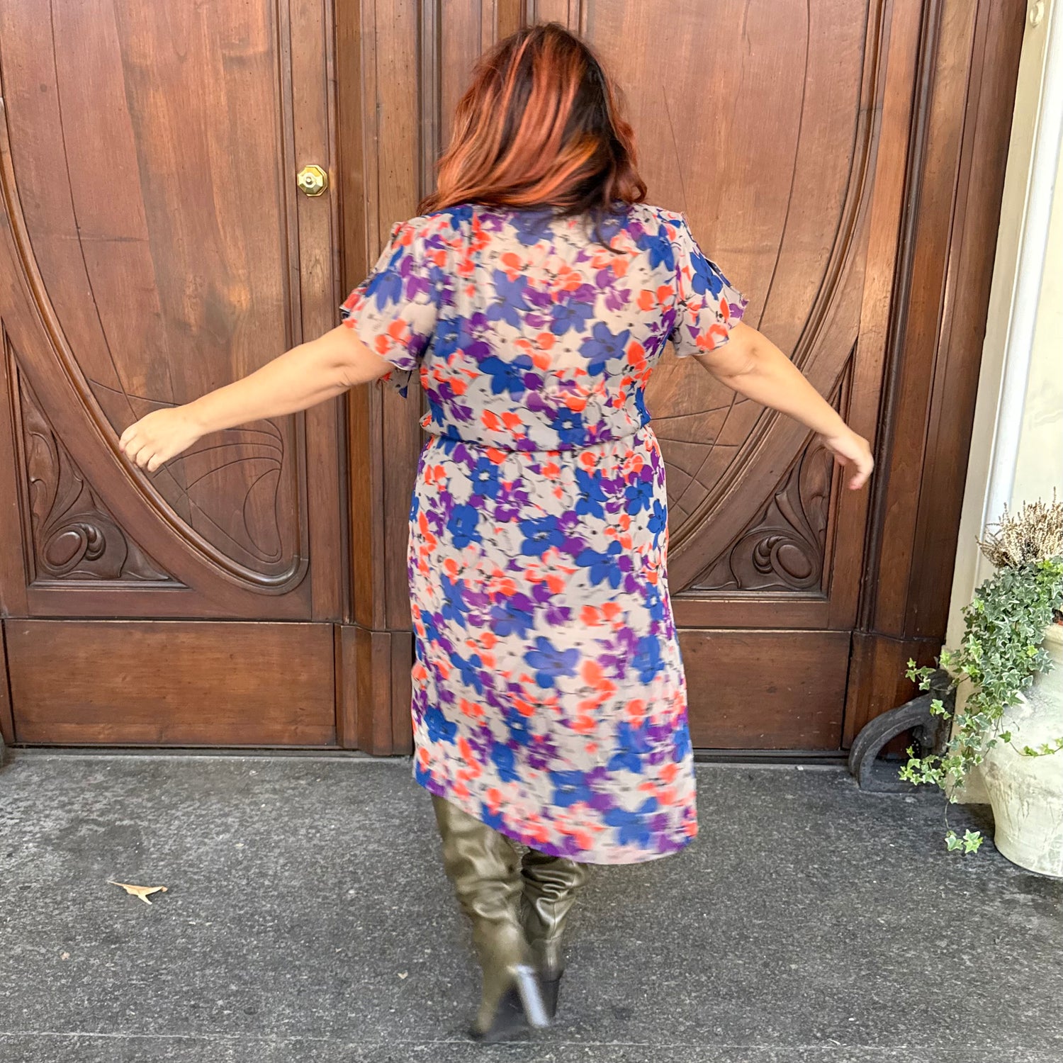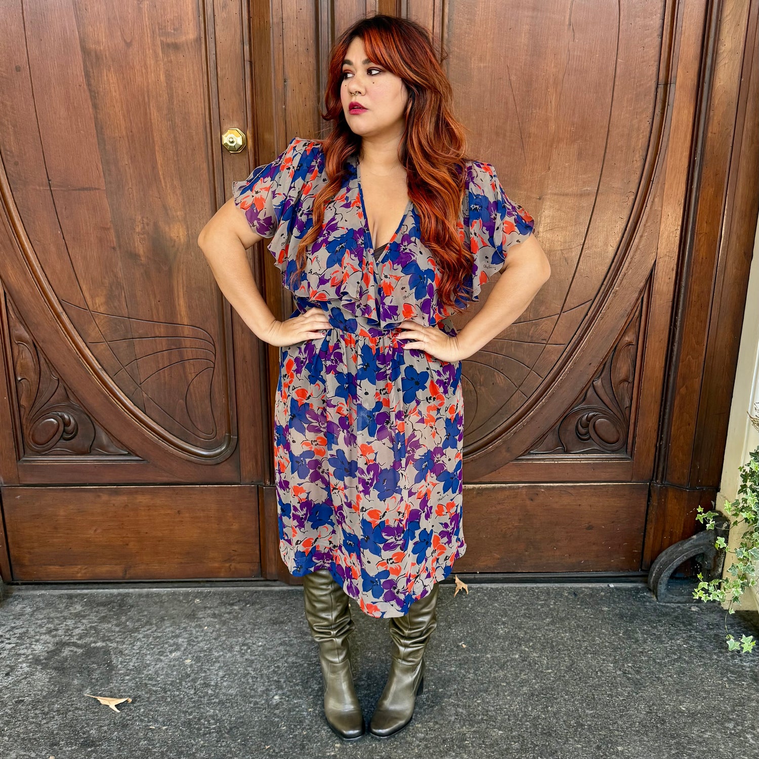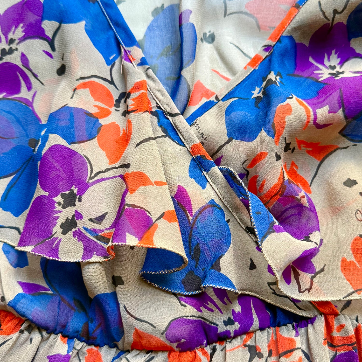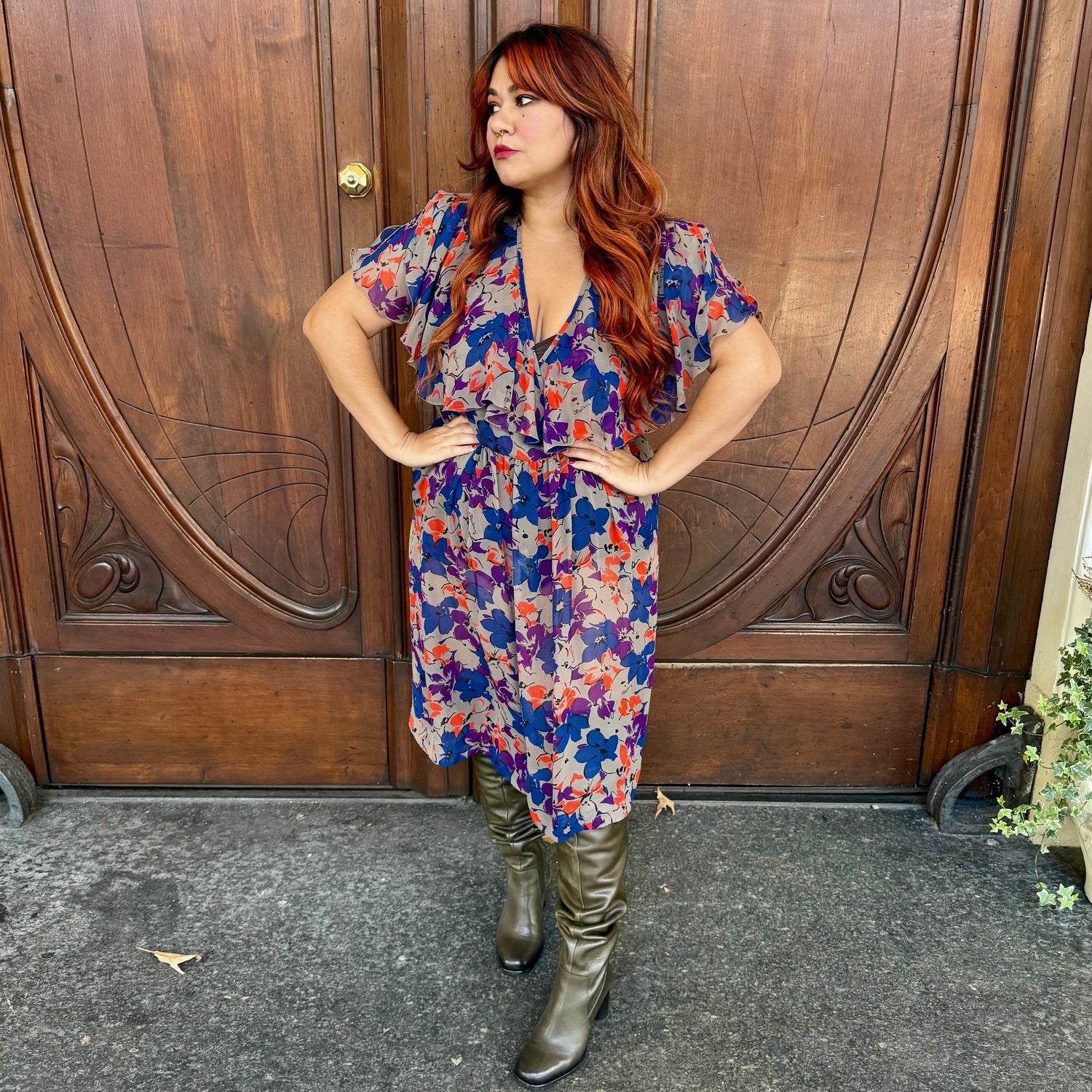 Lui è davvero un pezzo incredibile: Oleg Cassini abito fiori in seta. Ha un fit unico davvero donante, la parte superiore ha uno scollo con volta che non stringe e non ingolfa anche i seni più prosperosi, vita più stenta elastica , tasche laterali e gonna midi. Maniche corte a petalo di fiore,spalline removibili