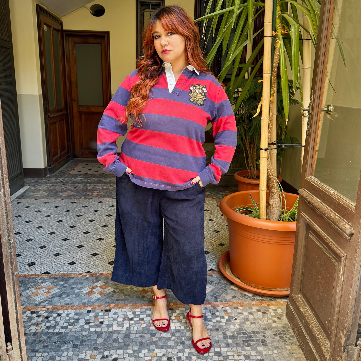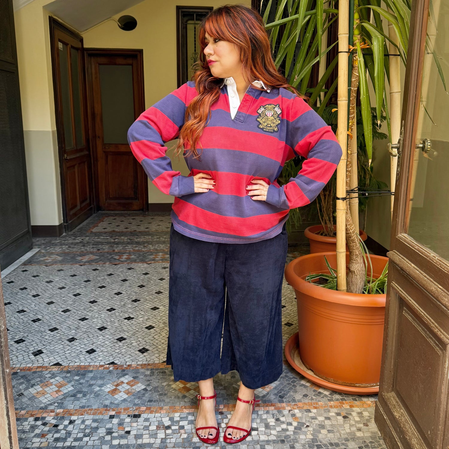 Iconica maglia R.L. da rugby 🏉 che ora è tornata di grande tendenza. Elegante e sportiva allo stesso tempo. Colore blu e rosso con toppa color oro. riporta tg XL veste tale. Bella portata over dalla tg 44 in poi.