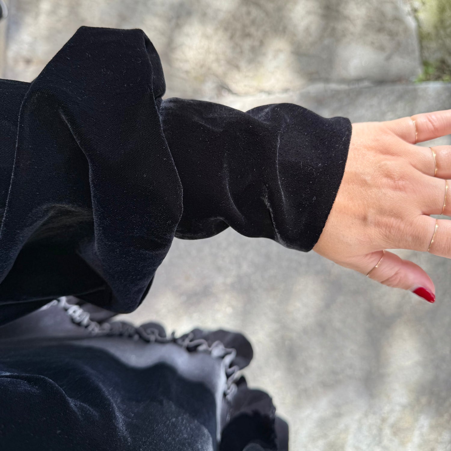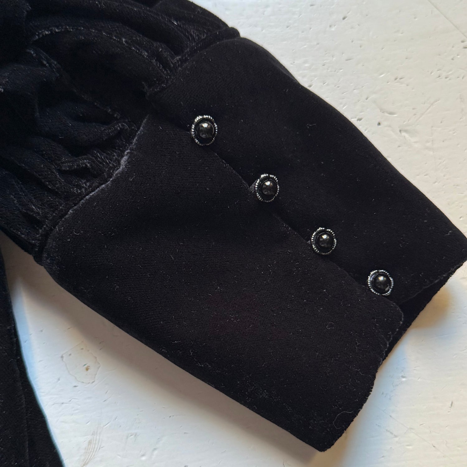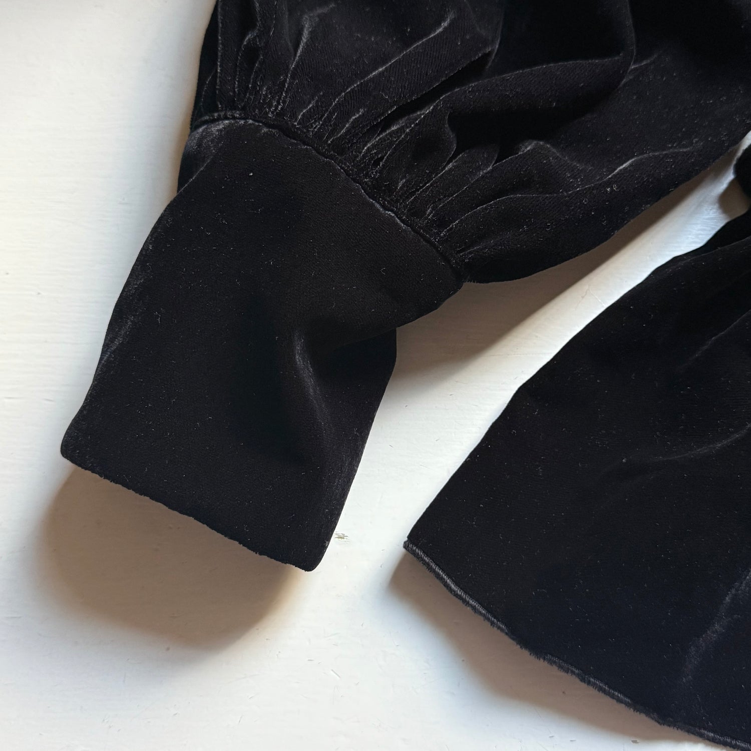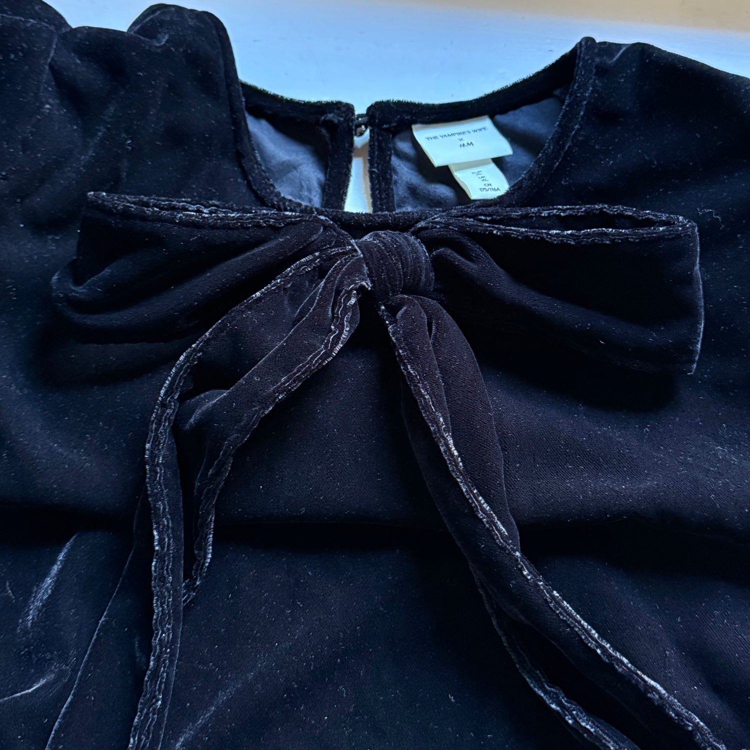 Stupendo abito in velluto nero del brand The vampire's wife per h&m (collezione 2020). Brand di culto britannico dalla femminilità oscura e dark ma molto chic. Il vestito ha le maniche a sbuffo più stette sui polsi,forma leggermente a trapezio con gonna svolazzante e fiocco sul colletto. Veste over dalla tg 46 in poi.